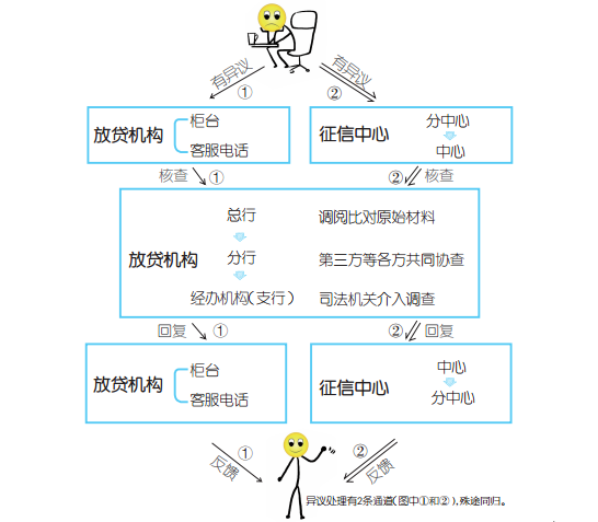对于信用报告中出现的“错误”,用户可以提出异议处理。目前,异议处理共有两条通道,一条是找放贷机构,一条是找征信中心。具体流程如下图所示。