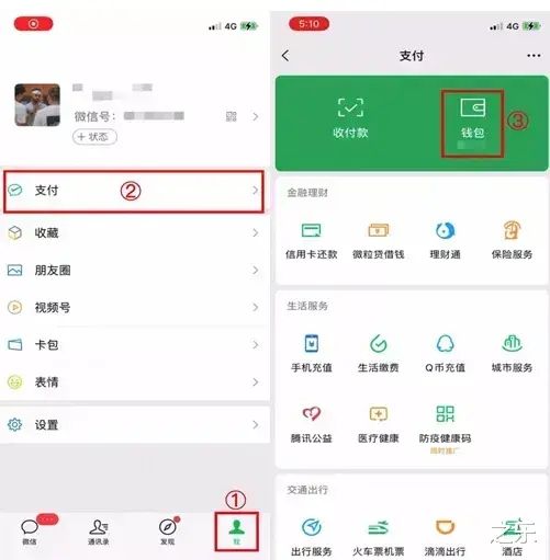 打开微信后,点击界面「我」,然后点击「支付」选项,进入支付页面后点击「钱包」。