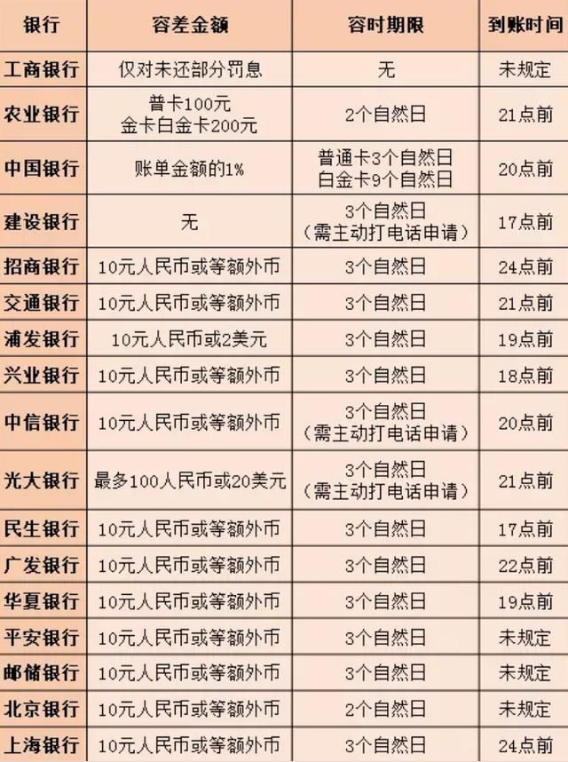 部分银行容时容差服务明细,可能有不准确,详询银行