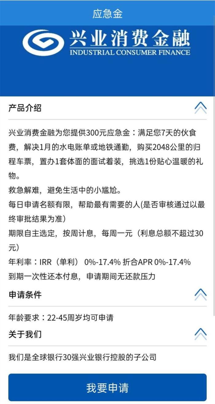 那这个是什么呢?这个就是兴业银行旗下的兴业消费金融产品的一个东西,那你们也没想到吧,兴业银行这边也有一点羊毛路,那今天呢,就跟你们说一下这个东西到底要怎么申请,那这个呢,就是兴业消费金融旗下的一款叫应急金的一个产品